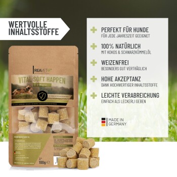 Dank der natürlichen Rezeptur mit Kokosnussraspeln, Schwarzkümmelöl, Spirulina und Colostrum unterstützen die REAVET Vital Soft Happen - Z-Blocker Snacks den Zellstoffwechsel und tragen zu einer normalen Hautfunktion Deines Hundes bei.
