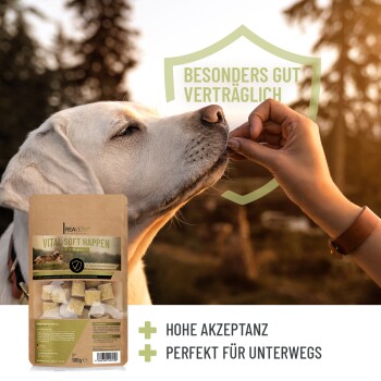 Das Z in Z-Blocker steht für Zellschutz – als Symbol für die tägliche Unterstützung der Zellaktivität und Vitalität Deines Hundes. Die Vital Soft Happen sind ideal für die tägliche Fütterung, zu jeder Jahreszeit. Sie sind gut verträglich und zeichnen sich durch eine hohe Akzeptanz bei Hunden aus. Ohne künstliche Farbstoffe, Aromen, Zucker oder Gentechnik.