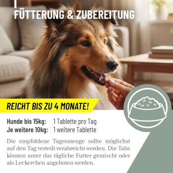 *Die empfohlene Tagesmenge sollte möglichst auf den Tag verteilt verabreicht werden. Die Tabs können unter das tägliche Futter gemischt oder als Leckerchen angeboten werden.