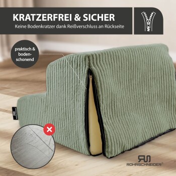- Eigenschaften: rutschfeste Unterseite mit Anti-Rutsch-Beschichtung, bodenschonender Reißverschluss hinten, waschbarer Bezug, Fertigung in der EU, vier Farbvarianten verfügbar.
