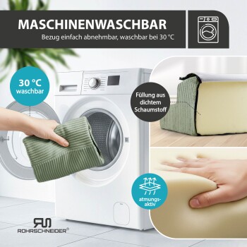 - Pflegeleichter Cordbezug: Dank Reißverschluss nimmst du den Cordbezug schnell ab und gibst ihn in die Waschmaschine bei 30°C. So bleibt die Oberfläche hygienisch, sauber und gemütlich.