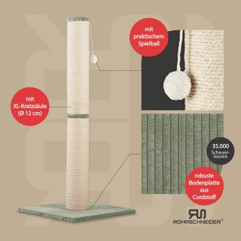 Rohrschneider ® Kratzbaum XL, extra dicke Kratzsäule Ø 12 cm, mit Spielzeug, Bodenplatte mit Cordbezug hellgrün 45 cm, 1,07 m, 45 cm