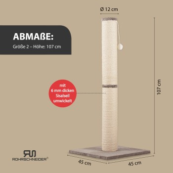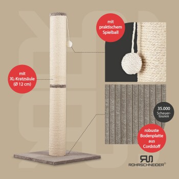 Rohrschneider ® Kratzbaum XL, extra dicke Kratzsäule Ø 12 cm, mit Spielzeug, Bodenplatte mit Cordbezug taupe 45 cm, 1,07 m, 45 cm