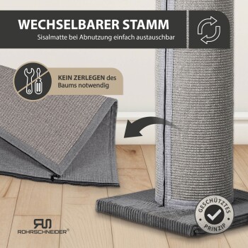 - Austauschbare Kratzmatte - Die großflächige Kratzmatte lässt sich über einen starken Reißverschluss in Sekunden abnehmen und ersetzen. Du wechselst nur die strapazierte Fläche, sparst Geld und Ressourcen und dein Kratzstamm sieht wieder aus wie neu.