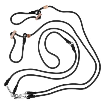 Die Umhängeleine ist zweifach verstellbar und lässt sich bequem an deine Körpergröße oder deinen Einsatzzweck anpassen. Sie eignet sich sowohl für die Arbeit im Gelände als auch für Spaziergänge oder Stadtbesuche. Und falls du einmal drei Hunde führen möchtest, kannst du sie einfach durch ein Zusatzstück erweitern.