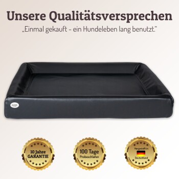 Der hohe Rand erinnert an die Wolfskuhle und lädt zum Anlehnen und Kopfablegen ein, während das robuste Kunstleder das Bett nicht nur elegant wirken lässt, sondern es auch besonders hygienisch macht. Dank der pflegeleichten Oberfläche können Schmutz, Haare und Flüssigkeiten einfach abgewischt werden. So bleibt das Hundebett auch für Allergiker-Hunde stets sauber und frei von Milben, Bakterien oder Pilzen.