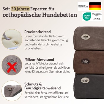 Mit einer 10-Jahres-Garantie auf den Matratzenkern, austauschbaren Bezügen in vielen Farben (z. B. Cord oder Kunstleder) und einer dauerhaften Formstabilität ohne Durchliegen überzeugt das KUDDE Hundebett in jeder Größe – ob Hundekörbchen für kleine Hunde, Hundebett mittelgroße Hunde oder Hundebett XXL für große Hunde.