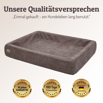 Mit einer 10-Jahres-Garantie auf den Matratzenkern, austauschbaren Bezügen in vielen Farben (z. B. Cord oder Kunstleder) und einer dauerhaften Formstabilität ohne Durchliegen überzeugt das KUDDE Hundebett in jeder Größe – ob Hundekörbchen für kleine Hunde, Hundebett mittelgroße Hunde oder Hundebett XXL für große Hunde.