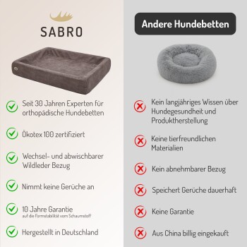 Das KUDDE Hundebett von SABRO ist seit 1995 das Original unter den orthopädischen Hundebetten – empfohlen vom bekanntesten Hundetrainer Deutschlands. Mehr als 500.000 Hunde schlafen bereits in diesem einzigartigen orthopädischen Hundekorb, der speziell für die gesunde Entlastung von Wirbelsäule und Gelenken entwickelt wurde.