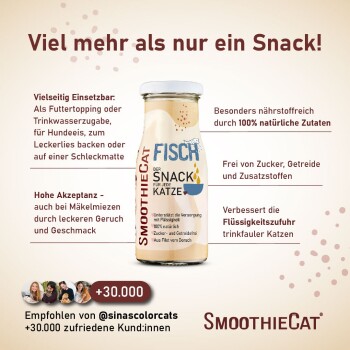 100 % natürlich, getreidefrei und ohne Zuckerzusatz – der SmoothieCat Katzensmoothie „Fisch“ ist der ideale Snack für Katzen, die den Geschmack des Meeres lieben. Ob zur Erfrischung, als Topping oder für zwischendurch – dieser Smoothie sorgt für Begeisterung im Napf.