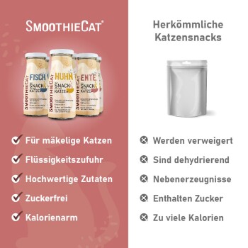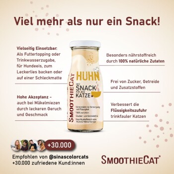 SmoothieCat ist ein Ergänzungsfuttermittel für Katzen, das ideal als Teil einer abwechslungsreichen und ausgewogenen Ernährung gefüttert werden kann. Die wiederverschließbare Flasche ermöglicht eine einfache Portionierung. Nach dem Öffnen sollte der Katzensmoothie im Kühlschrank gelagert und innerhalb von 3 Tagen verfüttert werden.