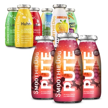 - 9x 250ml SmoothieDog – je 1x Huhn, Lamm, Rind, Gemüsebeet, Immunio, Trinkpause Ente + 3x Winter Pute