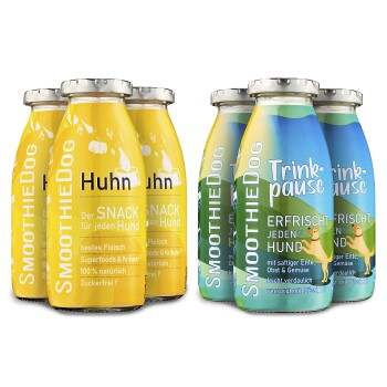 - 6x 250ml SmoothieDog – je 3x Huhn & 3x Trinkpause Ente