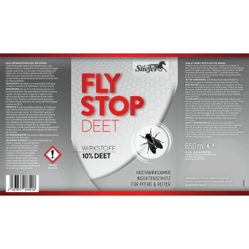 - FlyStop DEET® wirkt langanhaltend gegen lästige Insekten wie z.B. Bremsen, Hirschlausfliegen und Fliegen.