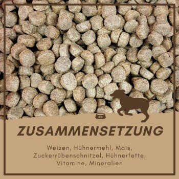 - Knackiges Trockenfutter für Hunde mit Huhn, wertvollen Hühnerfetten, leichtverdaulichem Mais, Rübenschnitzel für eine gesunde Darmbewegung und Weizen.
