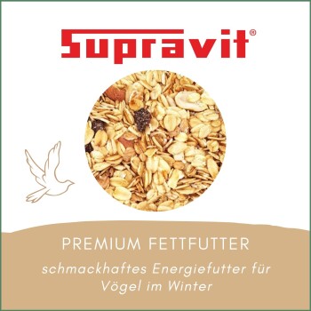 Unsere heimischen Wildvögel benötigen im Winter besonders viel Energie, um auch in der kalten Jahreszeit fit und munter zu bleiben. Doch besonders im Winter ist das Futterangebot für frei lebende Vögel eingeschränkt. Supravits Premiummischung ist ein sehr energiereiches Winterfettfutter. Leckere Rosinen, Erdnüsse und Fette sorgen nicht nur für Energie, sondern verfeinern auch das Vogelmenü und machen es besonders schmackhaft