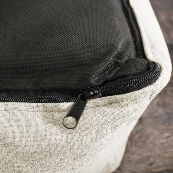 Der Bezug ist ein sehr eleganter, mehrfarbiger Stoff mit einem feinen Handwebcharakter. Die Struktur und Optik des Bezugsstoffes lassen sich mit fast jeder Wohnungseinrichtung in Einklang bringen. Der abgesenkte Eingang ermöglicht auch älteren Hunden einen einfachen Einstieg in das Hundebett.