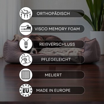 Die rechteckige Formgebung ist für Hunde perfekt, die gerne auf der Seite liegen und sich zum Schlafen auch gerne lang ausstrecken. Die Hundematratze wird aus einer unteren Lage PUR-Schaum und einer mittleren Lage Formgedächtnisschaum VISCO (Memory Foam) hergestellt. Darüber befindet sich eine weiche Watte-Schicht.