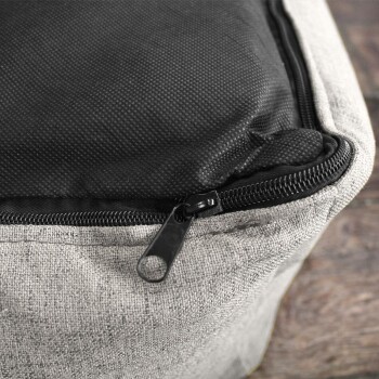 Der Bezug ist ein sehr eleganter, mehrfarbiger Stoff mit einem feinen Handwebcharakter. Die Struktur und Optik des Bezugsstoffes lassen sich mit fast jeder Wohnungseinrichtung in Einklang bringen. Der abgesenkte Eingang ermöglicht auch älteren Hunden einen einfachen Einstieg in das Hundebett.