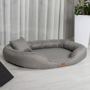 Das orthopädische Hundebett SAMMY VISCO ist ideal für die Prophylaxe und Behandlung bei HD. Vor allem große und schwere Hunde, die unter Gelenkproblemen leiden, wissen die Vorteile eines orthopädischen, gesunden Hundebettes zu schätzen. Die viscoelastische Hundematratze wird aus einer unteren Lage PUR-Schaum und einer mittleren Lage Formgedächtnisschaum VISCO (Memory Foam) hergestellt. Darüber befindet sich eine weiche Watte-Schicht. Der Bezug des Hundebettes aus Polyester besitzt durch die Struktur eine prächtige Erscheinung. Dieses fest gewebte Polyester 600D ist zudem bekannt für seine Belastbarkeit. Dank der klassischen ovalen Form und dem erhöhten Rand können sich Hunde gemütlich einrollen und den Kopf angenehm erhöht ablegen. Die Serie besteht aus 3 Größen (L 100cm, XXL 140cm, Übergroße XXXL 170cm) und 5 Farben (braun, graphit, schwarz, bordeaux, creme).