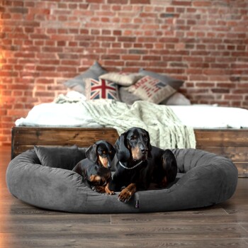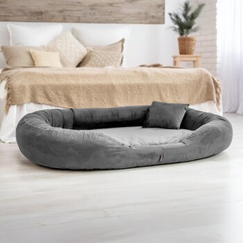 Das orthopädische Hundebett SAMMY VISCO ist ideal für die Prophylaxe und Behandlung bei HD. Vor allem große Hunde, die unter Gelenkproblemen leiden, wissen die Vorteile eines orthopädischen, gesunden Hundebettes zu schätzen. Die viscoelastische Hundematratze wird aus einer unteren Lage PUR-Schaum und einer mittleren Lage Formgedächtnisschaum VISCO (Memory Foam) hergestellt. Darüber befindet sich eine weiche Watte-Schicht. Der samtweiche Bezug aus TRITON wird höchsten Qualitätsansprüchen gerecht, die modernste DIRT-LIQUID-PROTECT Technologie mit reduzierter Feuchtigkeits- und Schmutzaufnahme zeichnet den High-Tech Velours-Stoff aus. Das Hundebett SAMMY VISCO kann ohne Weiteres mit einem Tuch feucht abgewischt werden. Dank der klassischen ovalen Form und dem erhöhten Rand können sich Hunde gemütlich einrollen und den Kopf angenehm erhöht ablegen. Die Serie besteht aus 4 Größen (L 100 cm, XXL 140 cm, XXXL 170 cm, Übergröße XXXXL 220 cm) und 6 Farben (Braun, Graphit, Schwarz, Bordeaux-Rot, Beige, Hellbraun).