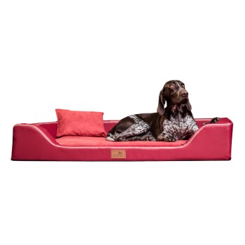 Ein Hundesofa der absoluten Luxusklasse! Das Hundebett MELODY wird ausschließlich in professioneller Handarbeit für Sie gefertigt. Dieses extravagante Modell wird aufwendigst veredelt. Unser Know-how im Bereich Hundemöbel hilft uns Meisterwerke zu schaffen. Ultra-Latex-Matratze bezogen mit pflegeleichtem & weichem High-Tech-Velours und Kunstleder oder komplett aus Kunstelder in bester Qualität, Punktelastizität und Formstabilität. Orthopädisches Hundebett im edlen Sofa-Design mit aufwendigen Verzierungen. Hundehaare und Dreck können schnell rückstandslos entfernt werden (Anti-Haar-Eigenschaft). Gesunder & ruhiger Schlaf im Luxus-Bett. Der hochwertig mit Kunstleder bezogene Rand umgibt die Latex- Matratze. Absolut pflegeleicht. Diese humanmedizinisch bewährte Materialwahl eignet sich für Hunde, die von Risiken oder Schäden an Knochen, Gelenken oder Wirbelsäule betroffen sind.