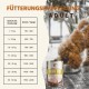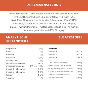 Unser Adult Trockenfutter mit Huhn & Kräuter ist getreidefrei, glutenfrei und hypoallergen. Das feinste, frisch zubereitete Huhn wird bei sanften 82 Grad gegart, um das wertvolle Eiweiß zu schützen, die Verdaulichkeit zu erhöhen und den Geschmack zu verbessern. Huhn ist eine fettarme Proteinquelle und reich an Aminosäuren. Es ist eine gute Quelle für Vitamine und Mineralien, einschließlich Vitamin B und Eisen, die zur allgemeinen Gesundheit und zum Wohlbefinden deines Hundes beitragen. Kräuter enthalten wertvolle Vitamine und bekömmliche pflanzliche Wirkstoffe wie z. B. antibakterielle Wirkstoffe und Antioxidantien.ZusammensetzungHuhn 55% (enthält frisch zubereitetes Huhn 31%, getrocknetes Huhn 21% und Hühnerbrühe 3%), Süßkartoffel (26%), Erbsen (6%), Kartoffeln, Rübenschnitzel (entzuckert), Leinsamen, Fischöl (1%), Mineralien, Kräuter (0,3% enthält Majoran, Basilikum, Oregano, Salbei, Thymian, Petersilie), Fructooligosaccharide (FOS, 96 mg/kg), Mannanoligosaccharide (MOS, 24 mg/kg)Analytische BestandteileRohprotein 27%, Rohfett 14 %, Rohfaser 4%, Rohasche 7,5 %, Feuchtigkeit 8%, Stickstofffreie Extraktstoffe 39,5%, Umsetzbare Energie 366 kcal/100g, Omega-6-Fettsäuren 2,3%, Omega-3-Fettsäuren 1,3%, Kalzium 1,4%, Phosphor 1%Ernährungsphysiologische Zusatzstoffe pro KilogrammVitamine: Vitamin A 15.000 IE, Vitamin D3 2.000 IE, Vitamin E 95 IE; Spurenelemente: Zink (Zinksulfat-Monohydrat) 50 mg, Eisen (Eisen(II)-sulfat-Monohydrat) 50 mg, Mangan (Mangansulfat-Monohydrat) 35 mg, Kupfer (Kupfer(II)sulfat-Pentahydrat) 15 mg, Jod (als Calciumjodat, wasserfrei) 1 mg, Selen (Natriumselenit) 0,3 mgFütterungsempfehlung*alle Hunde sind unterschiedlich und die Richtlinien sollten angepasst werden, um Rasse, Alter, Temperament und Aktivitätsniveau des einzelnen Hundes zu berücksichtigen. Wenn du das Futter wechselst, stelle es bitte langsam über einen Zeitraum von zwei Wochen um. Stelle immer sicher, dass frisches und sauberes Wasser dem Hund zur Verfügung steht.HinweisBitte beachte, dass für die Bestellgröße 12 kg der Versand in einer 12 kg oder in 2x6 kg Abpackung erfolgen kann (je nach Verfügbarkeit).Daran erkennst du gutes Trockenfutter:1. offene Deklaration der Inhaltsstoffe✅ erfüllt das Wildfang® Trockenfutter2. wichtige Hauptbestandteile sind Fleisch, Gemüse, Vitamine, Mineralien und Spurenelemente✅ erfüllt das Wildfang® Trockenfutter3. Alarm bei folgenden Inhaltsstoffen wie Zucker, Melasse, Fructose oder Glucose oder auch Bezeichnungen wie „Bäckereierzeugnisse“ oder „Molkereierzeugnisse“✅ erfüllt das Wildfang® Trockenfutter4. Hoher Fleischanteil von mindestens 50%✅ erfüllt das Wildfang® Trockenfutter5. Anteil Rohprotein bei 18-25 %✅ erfüllt das Wildfang® Trockenfutter überdurchschnittlich6. Anteil Rohfett von 8-13%✅ erfüllt das Wildfang® Trockenfutter überdurchschnittlich Unser Wildfang® Premium Nassfutter Huhn pur eignet sich ideal als Alleinfuttermittel für deinen ausgewachsenen Hund und zeichnet sich durch seine einzigartige B.A.R.F Qualität aus.Das H