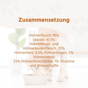 Unser Adult Trockenfutter mit Huhn & Kräuter ist getreidefrei, glutenfrei und hypoallergen. Das feinste, frisch zubereitete Huhn wird bei sanften 82 Grad gegart, um das wertvolle Eiweiß zu schützen, die Verdaulichkeit zu erhöhen und den Geschmack zu verbessern. Huhn ist eine fettarme Proteinquelle und reich an Aminosäuren. Es ist eine gute Quelle für Vitamine und Mineralien, einschließlich Vitamin B und Eisen, die zur allgemeinen Gesundheit und zum Wohlbefinden deines Hundes beitragen. Kräuter enthalten wertvolle Vitamine und bekömmliche pflanzliche Wirkstoffe wie z. B. antibakterielle Wirkstoffe und Antioxidantien.ZusammensetzungHuhn 55% (enthält frisch zubereitetes Huhn 31%, getrocknetes Huhn 21% und Hühnerbrühe 3%), Süßkartoffel (26%), Erbsen (6%), Kartoffeln, Rübenschnitzel (entzuckert), Leinsamen, Fischöl (1%), Mineralien, Kräuter (0,3% enthält Majoran, Basilikum, Oregano, Salbei, Thymian, Petersilie), Fructooligosaccharide (FOS, 96 mg/kg), Mannanoligosaccharide (MOS, 24 mg/kg)Analytische BestandteileRohprotein 27%, Rohfett 14 %, Rohfaser 4%, Rohasche 7,5 %, Feuchtigkeit 8%, Stickstofffreie Extraktstoffe 39,5%, Umsetzbare Energie 366 kcal/100g, Omega-6-Fettsäuren 2,3%, Omega-3-Fettsäuren 1,3%, Kalzium 1,4%, Phosphor 1%Ernährungsphysiologische Zusatzstoffe pro KilogrammVitamine: Vitamin A 15.000 IE, Vitamin D3 2.000 IE, Vitamin E 95 IE; Spurenelemente: Zink (Zinksulfat-Monohydrat) 50 mg, Eisen (Eisen(II)-sulfat-Monohydrat) 50 mg, Mangan (Mangansulfat-Monohydrat) 35 mg, Kupfer (Kupfer(II)sulfat-Pentahydrat) 15 mg, Jod (als Calciumjodat, wasserfrei) 1 mg, Selen (Natriumselenit) 0,3 mgFütterungsempfehlung*alle Hunde sind unterschiedlich und die Richtlinien sollten angepasst werden, um Rasse, Alter, Temperament und Aktivitätsniveau des einzelnen Hundes zu berücksichtigen. Wenn du das Futter wechselst, stelle es bitte langsam über einen Zeitraum von zwei Wochen um. Stelle immer sicher, dass frisches und sauberes Wasser dem Hund zur Verfügung steht.HinweisBitte beachte, dass für die Bestellgröße 12 kg der Versand in einer 12 kg oder in 2x6 kg Abpackung erfolgen kann (je nach Verfügbarkeit).Daran erkennst du gutes Trockenfutter:1. offene Deklaration der Inhaltsstoffe✅ erfüllt das Wildfang® Trockenfutter2. wichtige Hauptbestandteile sind Fleisch, Gemüse, Vitamine, Mineralien und Spurenelemente✅ erfüllt das Wildfang® Trockenfutter3. Alarm bei folgenden Inhaltsstoffen wie Zucker, Melasse, Fructose oder Glucose oder auch Bezeichnungen wie „Bäckereierzeugnisse“ oder „Molkereierzeugnisse“✅ erfüllt das Wildfang® Trockenfutter4. Hoher Fleischanteil von mindestens 50%✅ erfüllt das Wildfang® Trockenfutter5. Anteil Rohprotein bei 18-25 %✅ erfüllt das Wildfang® Trockenfutter überdurchschnittlich6. Anteil Rohfett von 8-13%✅ erfüllt das Wildfang® Trockenfutter überdurchschnittlich Unser Wildfang® Premium Nassfutter Huhn pur eignet sich ideal als Alleinfuttermittel für deinen ausgewachsenen Hund und zeichnet sich durch seine einzigartige B.A.R.F Qualität aus.Das Huhn versorgt deinen Hund mit allen wichtigen Mineralien und Vitaminen, ist reich an Aminosäuren und dient als gesunde Energiequelle. Durch den Verzicht von Getreide ist unser Nassfutter besonders bekömmlich und kann somit auch an Vierbeinern mit einer Getreideunverträglichkeit verfüttert werden.Alleinfuttermittel für ausgewachsene HundeInhalt: 6x 400g je DoseWichtige Merkmale auf einen Blick Ein Geschmackserlebnis für Deinen Vierbeiner: Das hochwertige Alleinfutter für Hunde ermöglicht deinem Hund eine gesunde und ausgewogene Ernährung, welches auch noch köstlich schmeckt. Pure Köstlichkeiten: Das Nassfutter in B.A.R.F. Qualität hat einen hohen Fleischanteil von 70% und besteht ausschließlich aus hochwertigem Muskelfleisch und Innereien, wie Herz, Leber, Lunge und Pansen Das Wohl deines Hundes steht bei uns an erster Stelle und deshalb verzichten wir komplett auf künstliche Farb- und Konservierungsstoffe, sowie Getreide und Zuckerzusätze Das HUHN versorgt deinen Hund mit allen wichtigen MINERALIEN und VITAMINEN, ist reich an AMINOSÄUREN und dient als gesunde ENERGIEQUELLE Lieferumfang: Getreidefreies Nassfutter für Hunde in den Geschmacksrichtungen Huhn, Lamm oder Rind in 6 x 400 g DoseZusammensetzung Nassfutter Huhn70% bestehend aus Hühnerherzen, Hühnerfleisch, Hühnerlebern, Hühnermägen* Die angegebenen Werte unterliegen den natürlichen Schwankungen der Rohstoffe. Kann produktionsbedingt Spuren von anderen Zutaten enthalten.Analytische BestandteileProtein 10,30%Fettgehalt 5,20%Rohasche 2,50%Rohfaser 0,50%Feuchtigkeit 80,00%Zusatzstoffe je Kilogramm/ Ernährungsphysiologische ZusatzstoffeVitamin D3 (3a671)* 200 I.E.Zink als Zinksulfat, Monohydrat (3b605)* 25 mgMangan als Mangan(II)-sulfat, Monohydrat (3b503)* 1,4 mgJod als Kalziumjodat, wasserfrei (3b202)* 0,75 mgWoran erkenne ich gutes Nassfutter für Hunde?1. Hoher Fleischanteil von mindestens 60%✅ erfüllt Wildfang® mit 70% überdurchschnittlich2. offene Deklaration von Inhaltsstoffen✅ erfüllt Wildfang®3. keine Zusatzstoffe wie Milch, Soja, Zucker, Farb- und künstliche Aromastoffe, Geschmacksverstärker und Nebenerzeugnisse✅ erfüllt Wildfang®4. Verzicht von Getreide und Gluten✅ erfüllt Wildfang®5. Anteil Rohprotein zwischen 8 und 12%✅ erfüllt Wildfang® mit 11% überdurchschnittlich6. Anteil Rohfett zwischen 4 und 6%✅ erfüllt Wildfang® mit 8% überdurchschnittlich7. Anteil Rohasche zwischen 1 und 3%✅ erfüllt Wildfang® mit 2%8. Anteil Rohfaser 0,5 - 1 %✅ erfüllt Wildfang® mit 0,4% noch besser