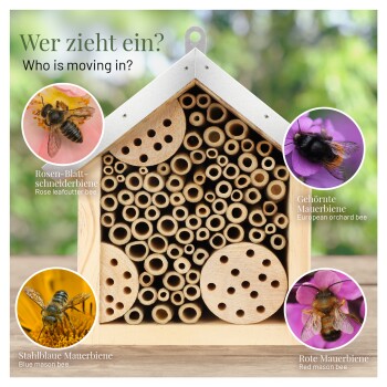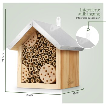 Die Befestigungsleiste aus Metall ermöglicht eine einfache Montage des Insektenhotels im Garten oder auf dem Balkon. Unser Bienenhotel bietet Lebensraum für verschiedene Bienenarten wie die Gehörnte Mauerbiene, Rosen-Blattschneiderbiene, Stahlblaue Mauerbiene und die Rote Mauerbiene.