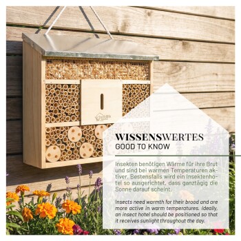 Ob hängend oder stehend, im Garten, auf der Terrasse oder am Balkon – die mitgelieferte Aufhängevorrichtung ermöglicht eine einfache Montage. Das Insektenhotel wird fertig montiert geliefert – Du kannst es direkt anbringen und sofort zum Schutz der heimischen Insekten beitragen.