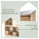Die Wildbienen-Villa besteht zu 100% aus unbehandeltem Naturholz. Das Metalldach schützt zuverlässig vor Nässe und sorgt dafür, dass das Innere trocken bleibt. Die natürlichen Füllmaterialien – darunter Bambus, Schilfrohr, Holzspäne und Rundhölzer – schaffen ideale Bedingungen für die Eiablage und Brutpflege vieler nützlicher Insekten.