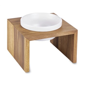 - NACHHALTIGES HOLZGESTELL MIT KERAMIKNAPF – Gefertigt aus Holz aus nachwachsendem Plantagenanbau, kombiniert mit einer herausnehmbaren Keramikschale.