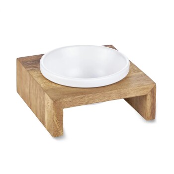 - NACHHALTIGES HOLZGESTELL MIT KERAMIKNAPF – Gefertigt aus Holz aus nachwachsendem Plantagenanbau, kombiniert mit einer herausnehmbaren Keramikschale.