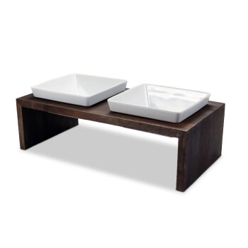 - ERGONOMISCHE FRESSPOSITION AUS NACHHALTIGEM HOLZ – Erhöhter Napf für eine komfortable, gelenkschonende Haltung beim Fressen.