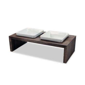 - ERGONOMISCHE FRESSPOSITION AUS NACHHALTIGEM HOLZ – Erhöhter Napf für eine komfortable, gelenkschonende Haltung beim Fressen.