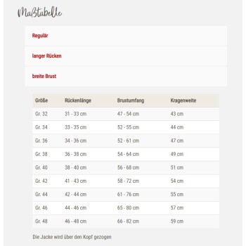 Die Jacke gibt es im regulären Schnitt sowie in der Sonder-Größe ""Dackel"" für die spezielle Körperform von Dackeln und anderen Hunden mit einem schmalen, langen Rücken.