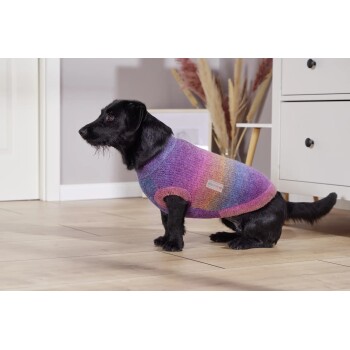 Der Strickpullover Rainbow ist ein wärmender Hundepullover für kühle Tage und die Übergangszeit. Das anschmiegsame, elastische Strickmaterial bietet hohen Tragekomfort und passt sich der Körperform optimal an – auch bei breiter gebauten Hunden. Der besondere Farbverlauf macht jeden Pullover zu einem einzigartigen Hingucker.